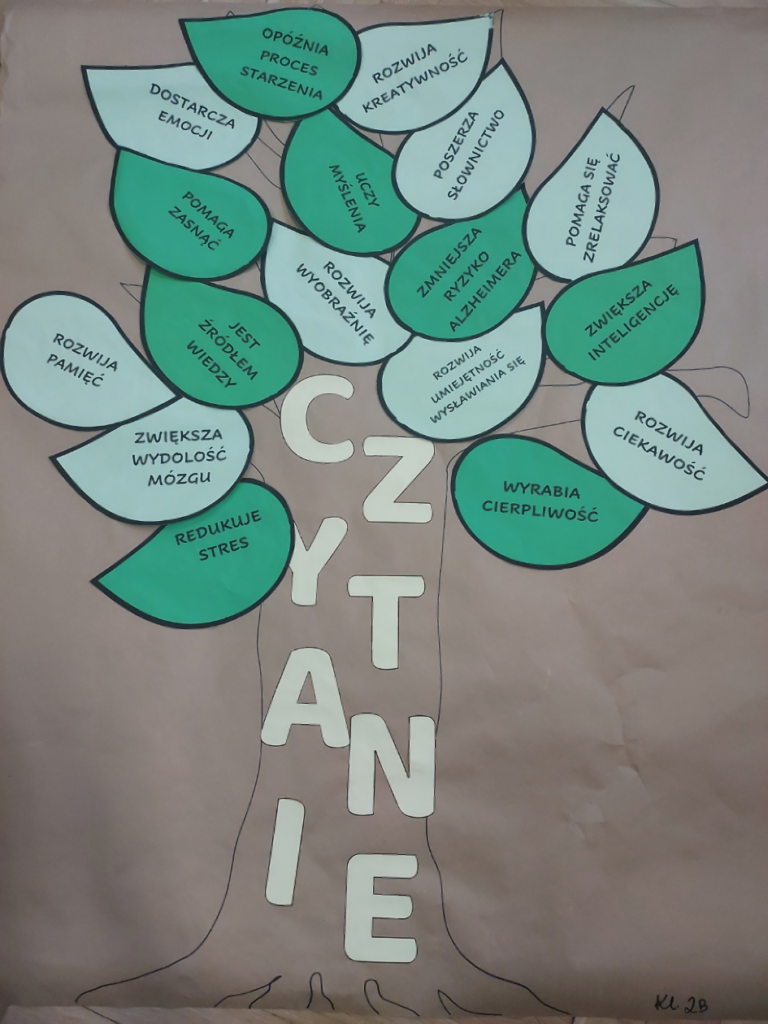 Uczniowie klasy 2b wraz z wychowawcą wykorzystując metodę burzy mózgów, zastanawiali się, jakie są korzyści z czytania książek. Wszystkie pomysły uczniów zostały umieszczone na plakacie w formie drzewa. Zachęcamy do czytania!