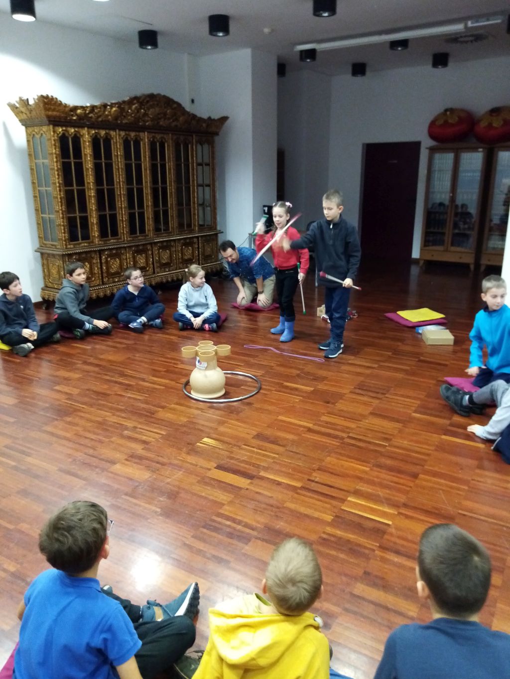 „Nudzę się!” – tak dzieci zazwyczaj reagują, gdy nie wiedzą co zrobić z wolnym czasem. Okazało się, że sporo prostych, a zarazem ciekawych sposobów na poradzenie sobie z nudą, znają pracownicy Muzeum Azji i Pacyfiku. 16 listopada 2022 r. właśnie w tym miejscu uczniowie klas trzecich poznawali azjatyckie gry i zabawy, które mogli od razu wypraktykować. Dowiedzieli się także o nich wiele interesujących rzeczy. Po ciekawych warsztatach uczniowie zwiedzili niezwykłe wystawy muzeum, które pokazywały kulturę Azji i Pacyfiku. Wizyta odbyła się w ramach programu „Kulturalna szkoła na Mazowszu”.