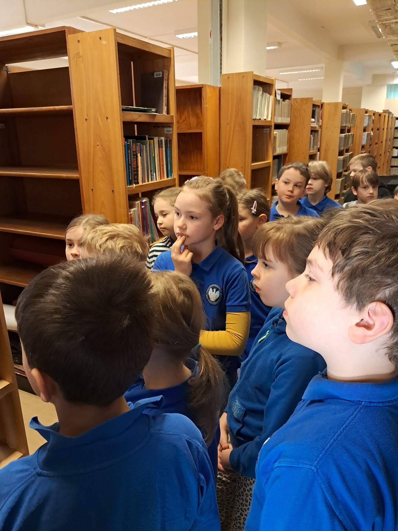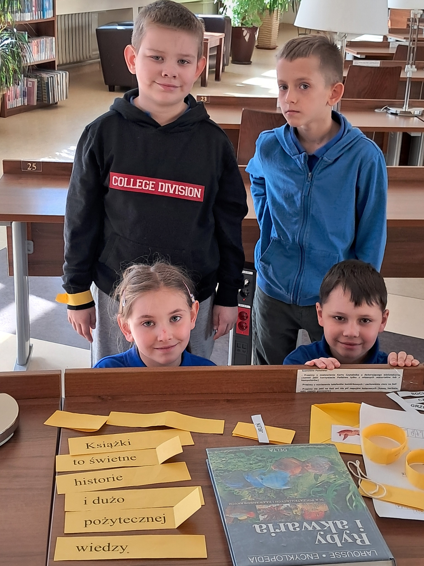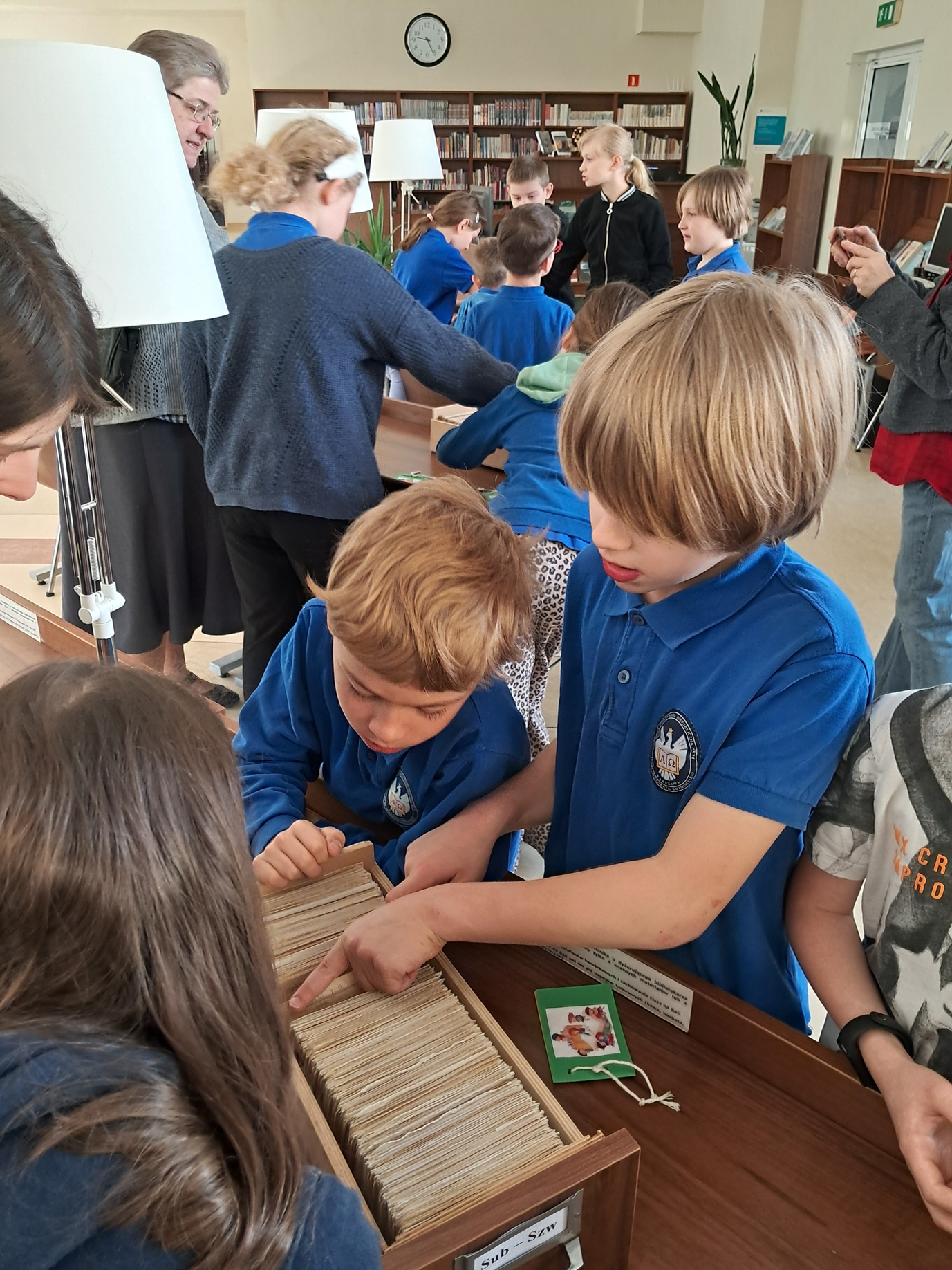 29 kwietnia klasy drugie wybrały się na wycieczkę do Biblioteki Publicznej dla Dzieci i Młodzieży przy ul. Romaszewskiego. Pani bibliotekarka zaprosiła dzieci do czytelni naukowej i zapoznała z księgozbiorem podręcznym oraz wytłumaczyła w jaki sposób należy szukać książek. Zaprowadziła także do magazynu bibliotecznego, gdzie pokazała najstarsze wolumeny i wytłumaczyła, co to jest księga inwentarzowa. Następnie podzieliła uczniów na grupy i zaprosiła do zabawy. Zadaniem uczniów było ułożenie wyrazów w kolejności alfabetycznej, rozwiązanie krzyżówki na podstawie bajek, dobieranie książek do haseł i ułożenie hasła o zaletach czytania. Na koniec lekcji p. Bibliotekarka zapoznała uczniów z dawnym sposobem katalogowania. Zadowoleni z lekcji uczniowie wrócili do szkoły.