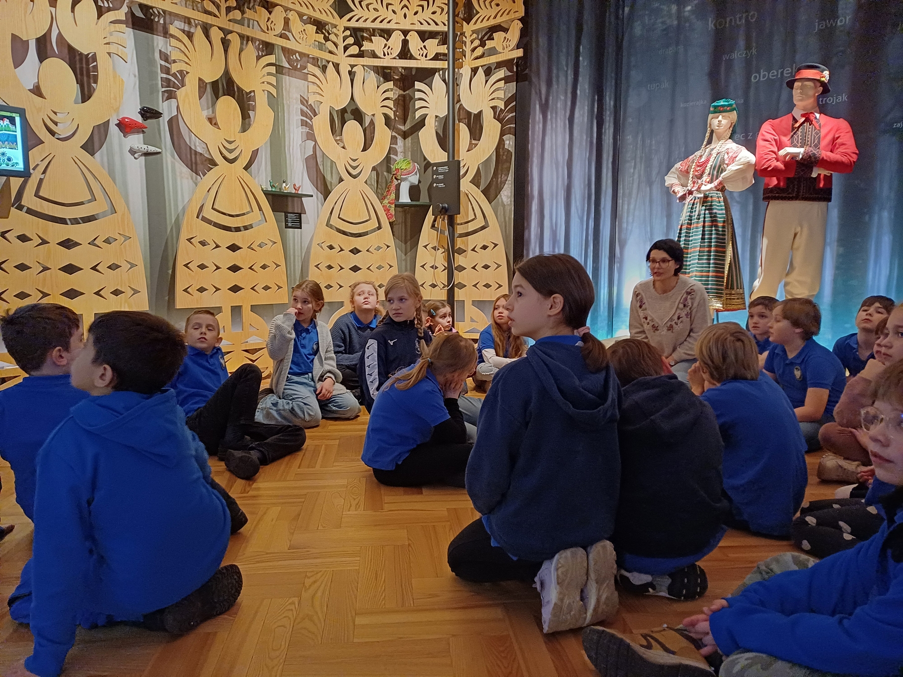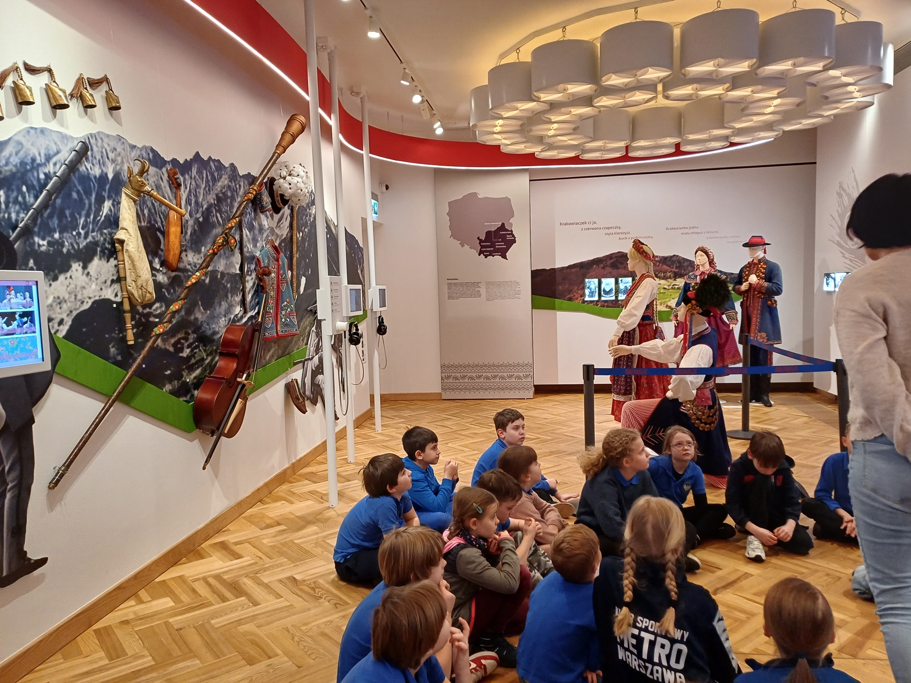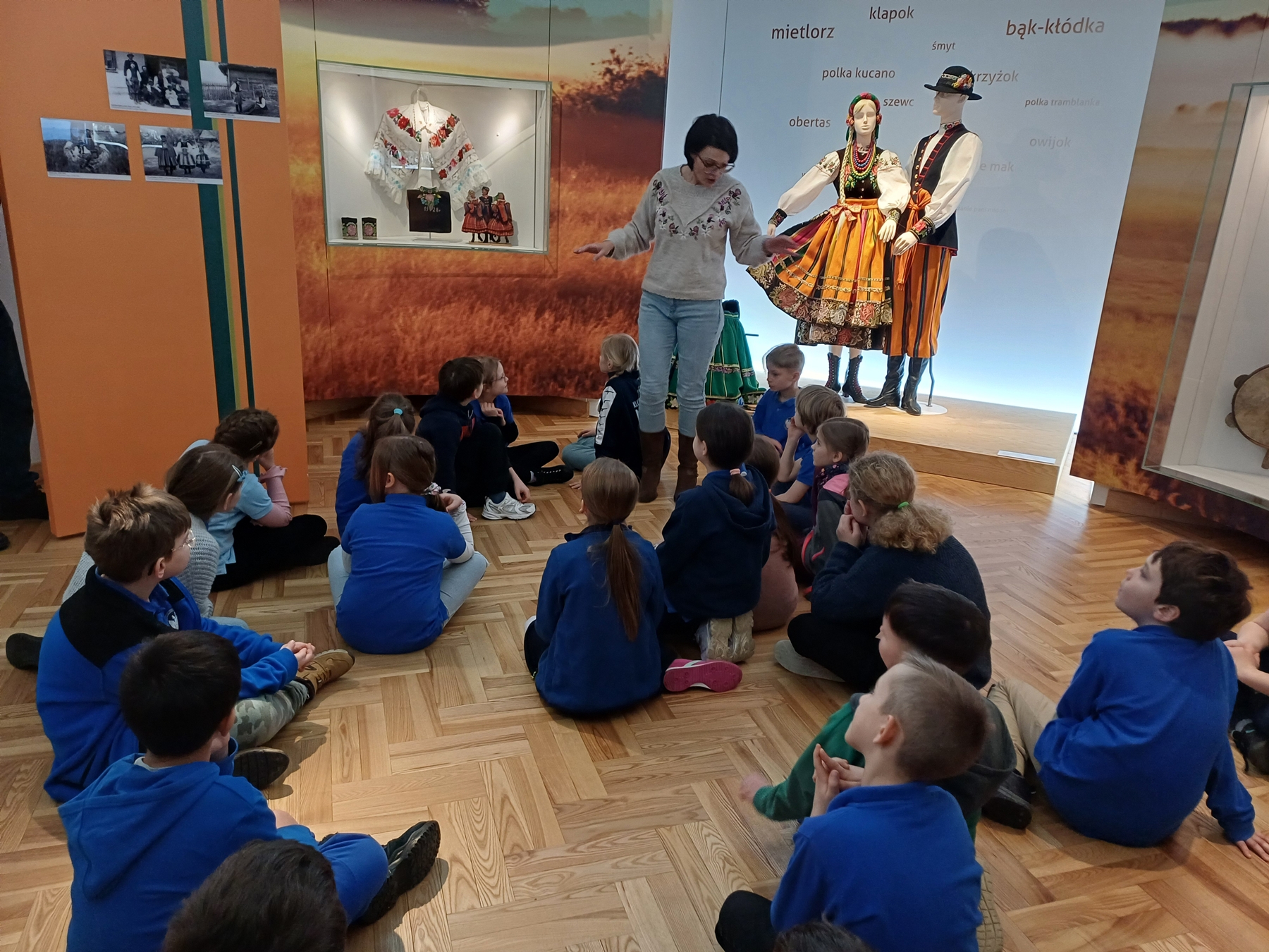 18 marca uczniowie klas I-III wybrali się do siedziby PZLPiT „Mazowsze”. Pierwsze kroki skierowali do Centrum Folkloru Polskiego, znajdującego się w historycznym Pałacu Karolin. Zwiedzili tam niezwykłą wystawę poświęconą różnym regionom Polski, poznając charakterystyczną muzykę ludową, stroje i zwyczaje. Uczestniczyli także w warsztatach „Wystrój się na ludowo”. Punktem kulminacyjnym dnia było obejrzenie widowiska muzycznego „Magiczna podróż – piękna nasza Polska cała”. Wspaniałe tańce, porywająca muzyka i barwne opowieści z nutką humoru, wprawiły młodych widzów w zachwyt i sprawiły wiele radości. To niezwykłe spotkanie z kulturą ludową na pewno na długo zapadnie w pamięć naszych uczniów. Pobyt realizowany był dzięki programowi „Kulturalna szkoła na Mazowszu”.