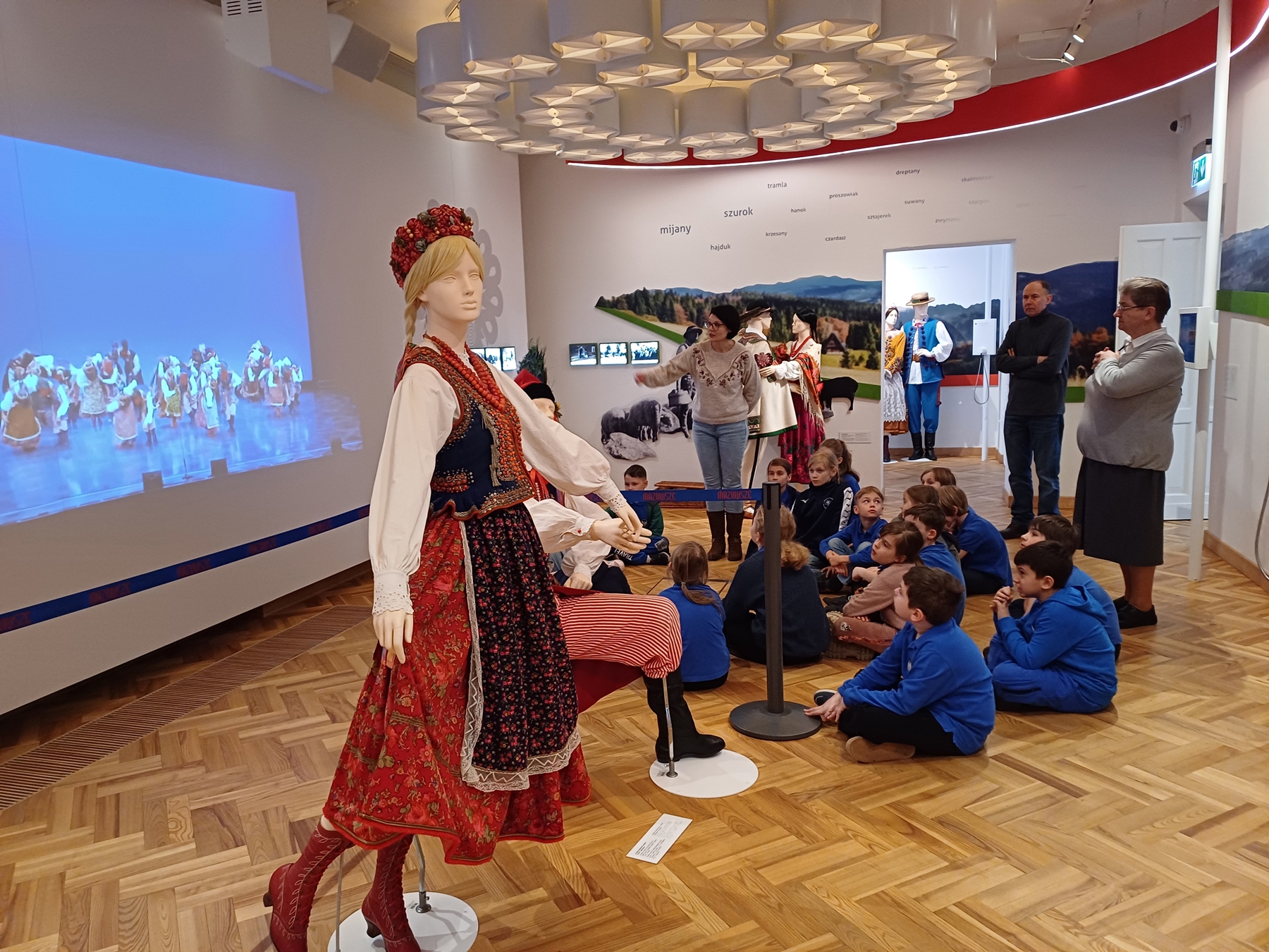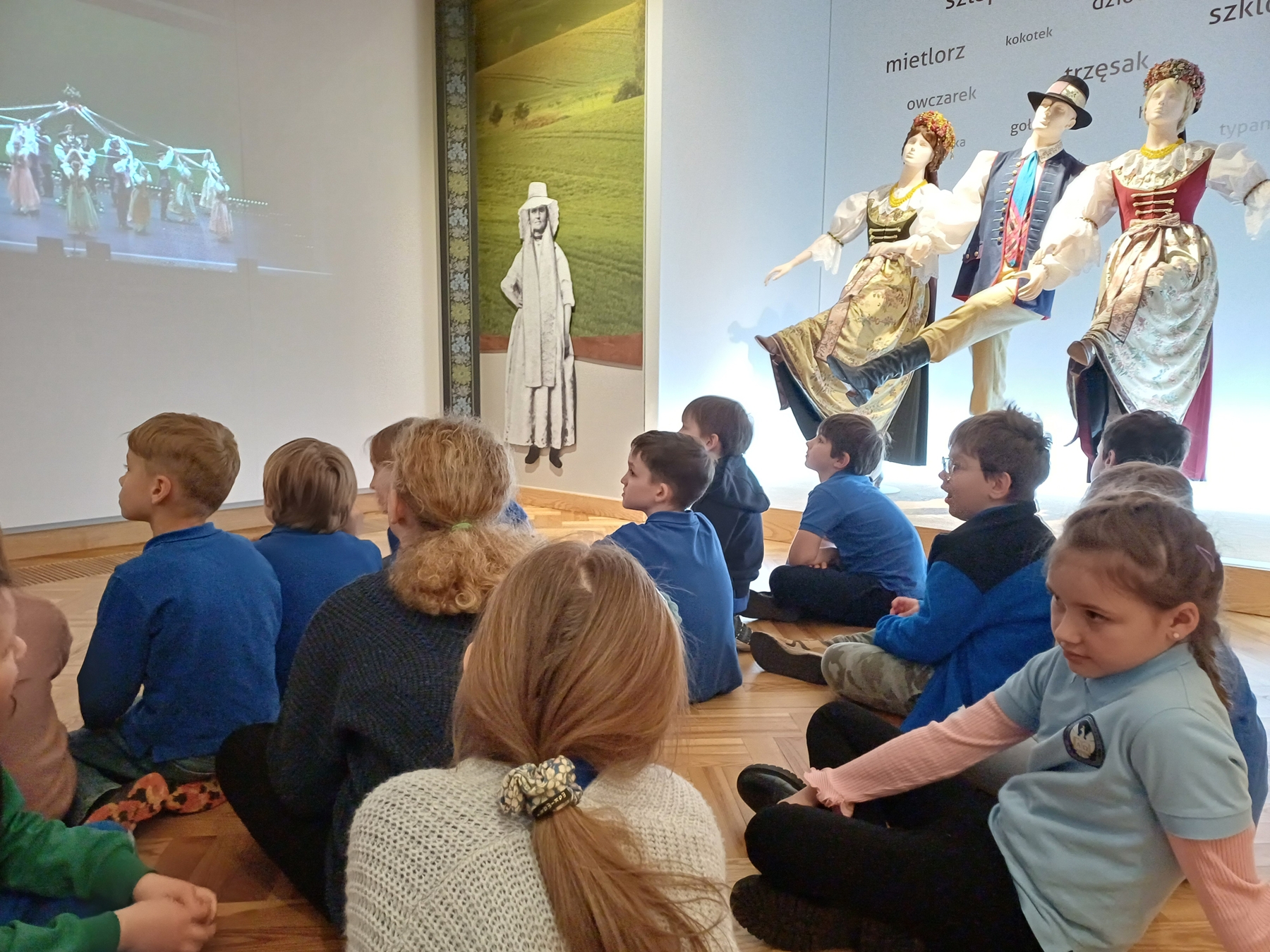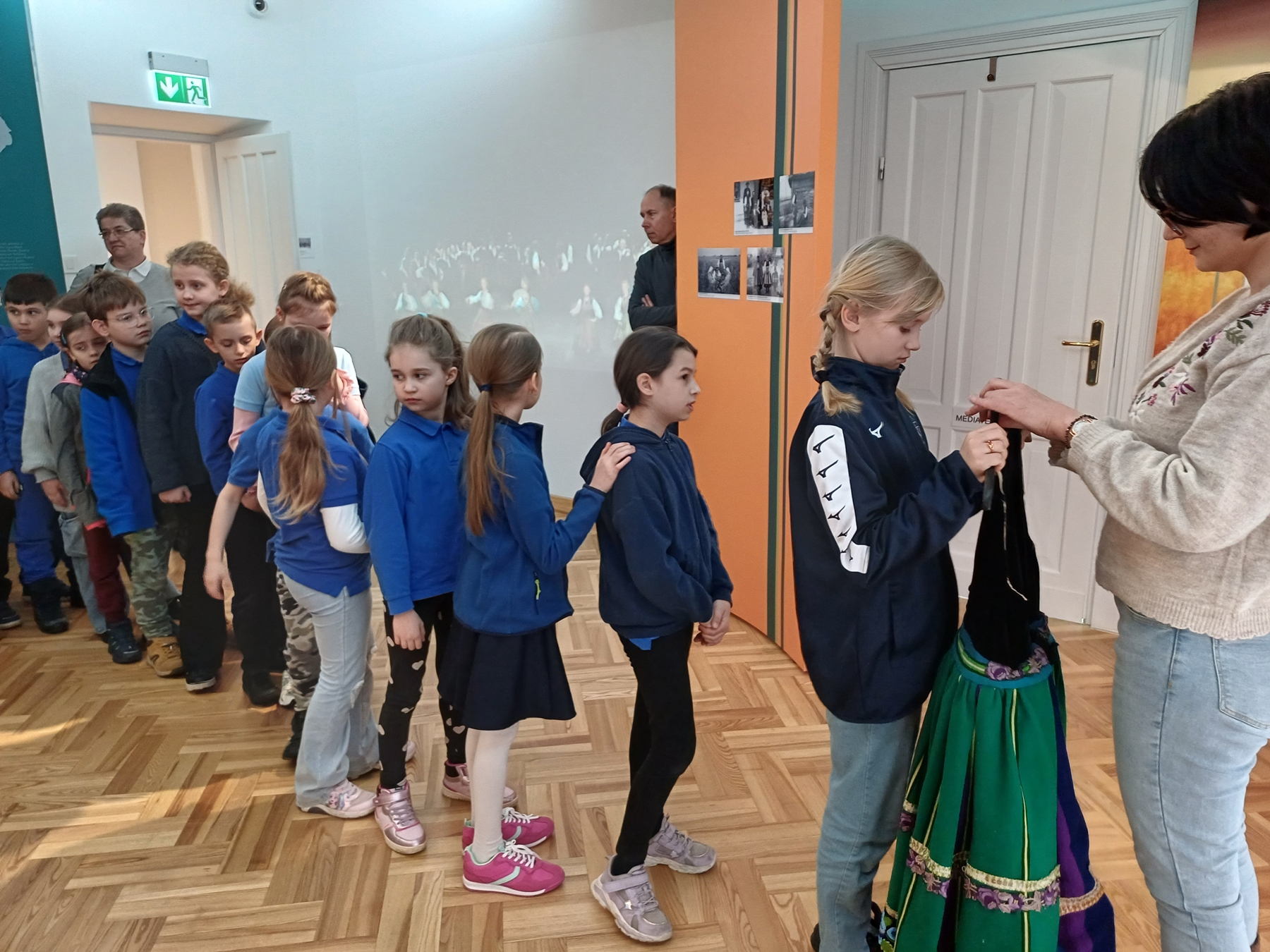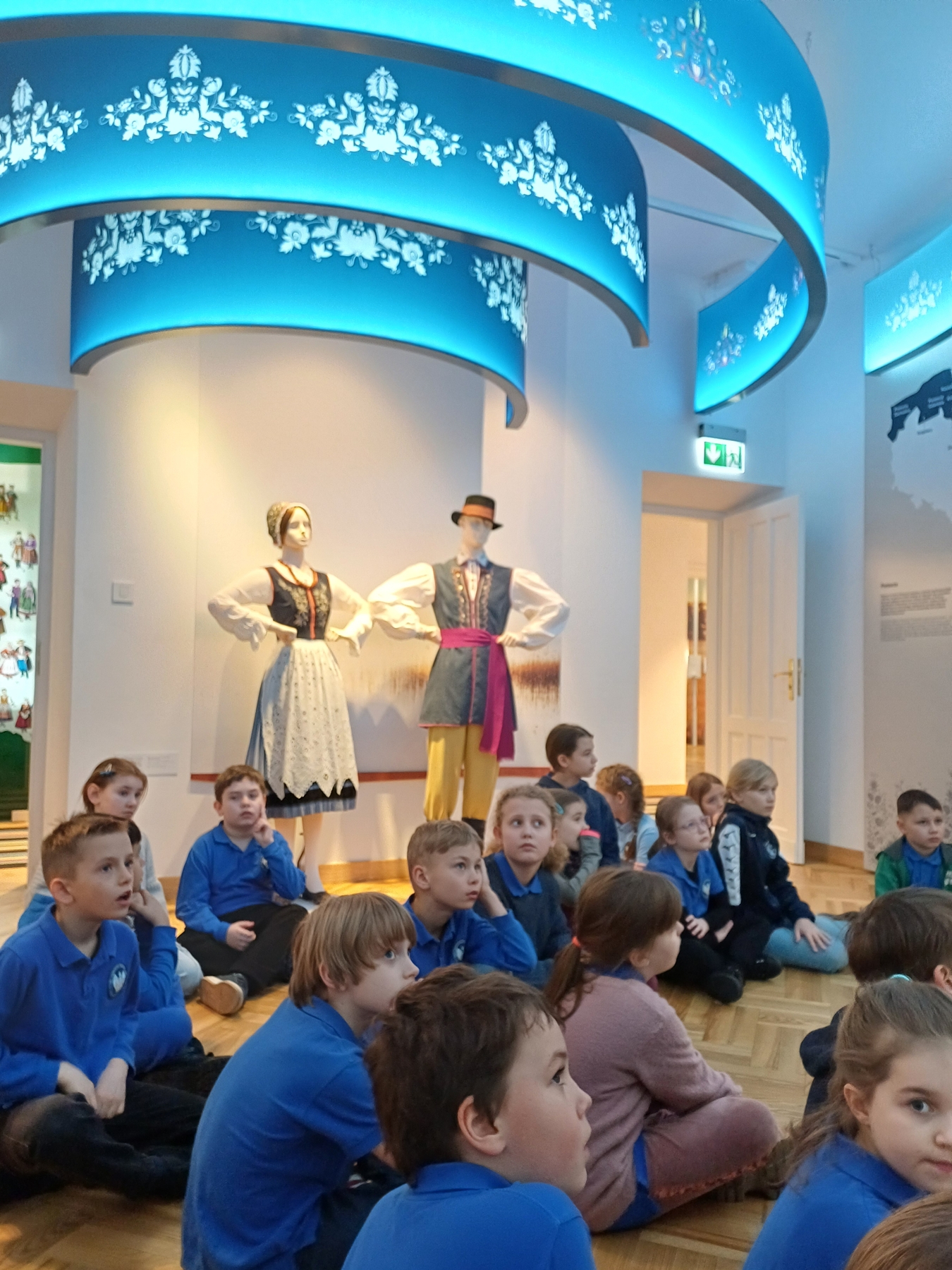 18 marca uczniowie klas I-III wybrali się do siedziby PZLPiT „Mazowsze”. Pierwsze kroki skierowali do Centrum Folkloru Polskiego, znajdującego się w historycznym Pałacu Karolin. Zwiedzili tam niezwykłą wystawę poświęconą różnym regionom Polski, poznając charakterystyczną muzykę ludową, stroje i zwyczaje. Uczestniczyli także w warsztatach „Wystrój się na ludowo”. Punktem kulminacyjnym dnia było obejrzenie widowiska muzycznego „Magiczna podróż – piękna nasza Polska cała”. Wspaniałe tańce, porywająca muzyka i barwne opowieści z nutką humoru, wprawiły młodych widzów w zachwyt i sprawiły wiele radości. To niezwykłe spotkanie z kulturą ludową na pewno na długo zapadnie w pamięć naszych uczniów. Pobyt realizowany był dzięki programowi „Kulturalna szkoła na Mazowszu”.