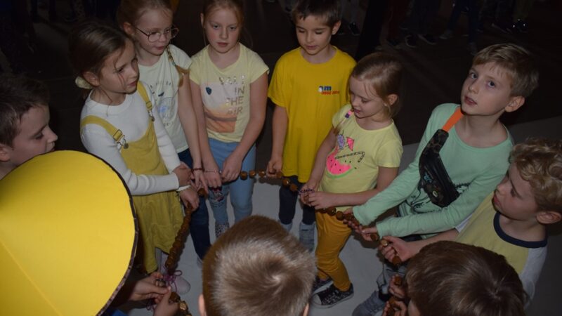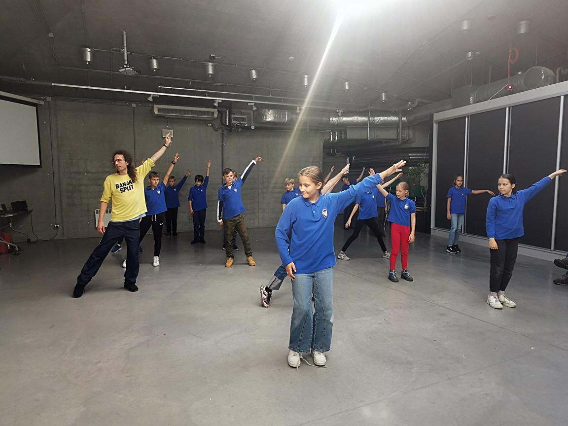 Uczniowie klasy 5 podczas wizyty na lekcji warsztatowej w Centrum Nauki Kopernik, zorganizowanej w ramach Warszawskiego Festiwalu Nauki, na podstawie układu tanecznego omawiali własności figur geometrycznych a także poznali podstawowe pomiary fizyczne ruchu ciała .