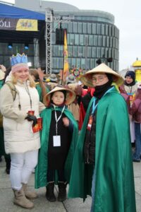 Po trzyletniej przerwie spowodowanej pandemicznymi ograniczeniami, reprezentacja naszej szkoły znów wzięła udział w warszawskim Orszaku Trzech Króli. Dzieci i młodzież w zielonych strojach dwórek i wojowników króla azjatyckiego Melchiora, pod opieką również przebranych rodziców, podążały za mędrcem z Dalekiego Wschodu do Stajenki na Placu Piłsudskiego. Jedna z naszych dwórek, Emilka oraz jej mama, zasiliły również szeregi chóru uświetniającego uroczystość na Placu Zamkowym. Hasłem Orszaku było zawołanie „Niechaj prowadzi nas gwiazda!”. Choć tegoroczna edycja ulicznych jasełek przyciągnęła wyraźnie mniej liczne grono dzieci, rodziców i szkół niż miało to miejsce w latach ubiegłych, kolorowy, rekordowo liczny tłum Warszawiaków w barwnych koronach dowodzi, iż jest to wydarzenie ważne i oczekiwane. Mamy zatem nadzieję, że w przyszłości nasza szkolna społeczność będzie aktywnie i licznie je współtworzyć, traktując to również jako publiczne wyznanie naszej wiary i radości z Bożego Narodzenia. Liczymy, że w przyszłym roku spotkamy się na orszakowej trasie w dużo większym gronie! Już dziś zachęcamy do zaangażowania się w to piękne wydarzenie!