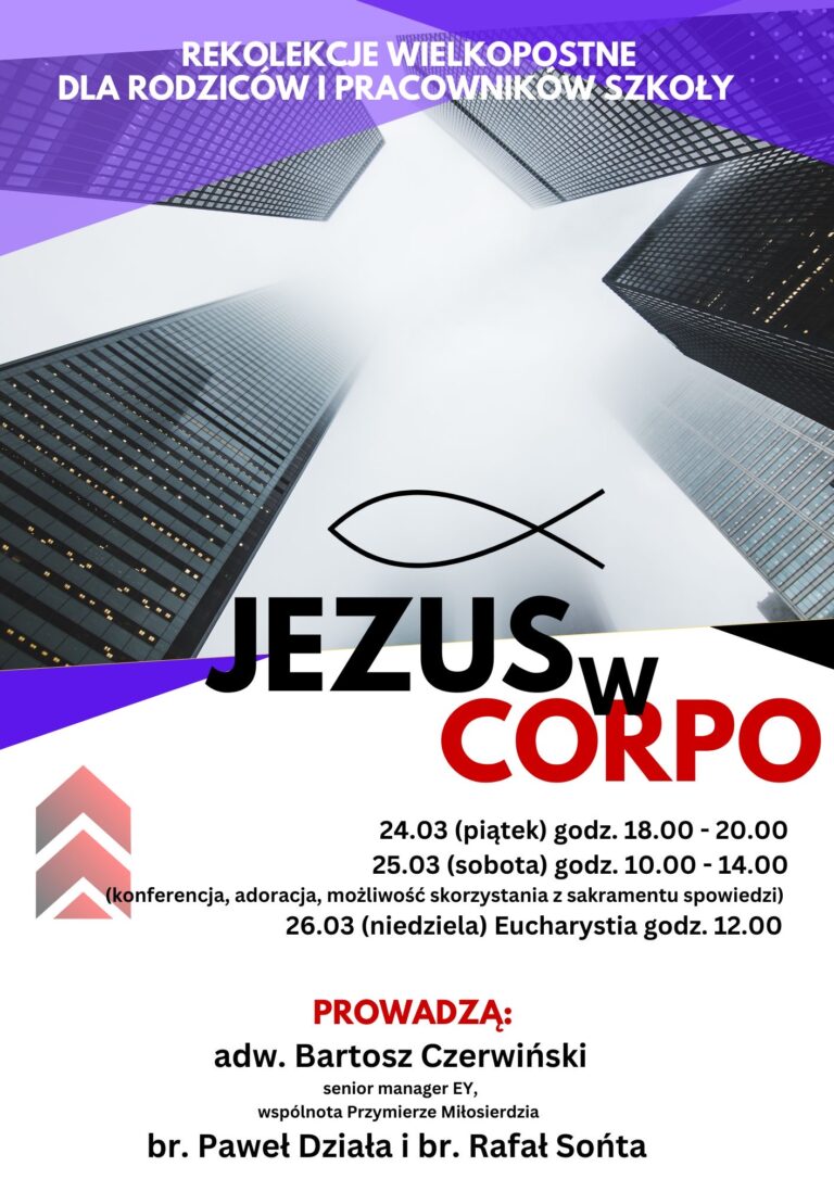 Od 22 - 24 marca odbyły się rekolekcje wielkopostne dla uczniów naszej szkoły. Rekolekcje poprowadził kapucyn o.Paweł Działa. Rekolekcje odbyły się pod hasłem „Przyjaciel”. Każdy dzień rozpoczęty był wspólnym spotkaniem, a następnie uczniowie uczestniczyli w katechezach i pracowali w grupach. Pierwszy dzień rekolekcji poświęcony był - Przyjaźni z samym sobą - akceptacji siebie i przyjęcia siebie. Drugi dzień rekolekcji poświęcony był – Przyjaźni z innymi – uczniowie zastanawiali się, co jest ważne w przyjaźni a co przeszkadza. Kształtowali w sobie postawę przyjacielską – wiedzą jak być dobrym przyjacielem. Natomiast trzeciego dnia, uczniowie rozwijali przyjaźń z Bogiem. W czasie rekolekcji nie zabrakło również czasu na wspólną Mszę św., Drogę Krzyżową, Adorację Najświętszego Sakramentu czy spowiedź. Wieczorem 24 marca swoje rekolekcje rozpoczęli rodzice i nauczyciele pod hasłem „Jezus w CORPO”, spotkając się także w sobotę 25 marca. W niedzielę rekolekcje zakończyła wspólna Eucharystia dla uczniów, rodziców i nauczycieli z błogosławieństwem rekolekcyjnym.