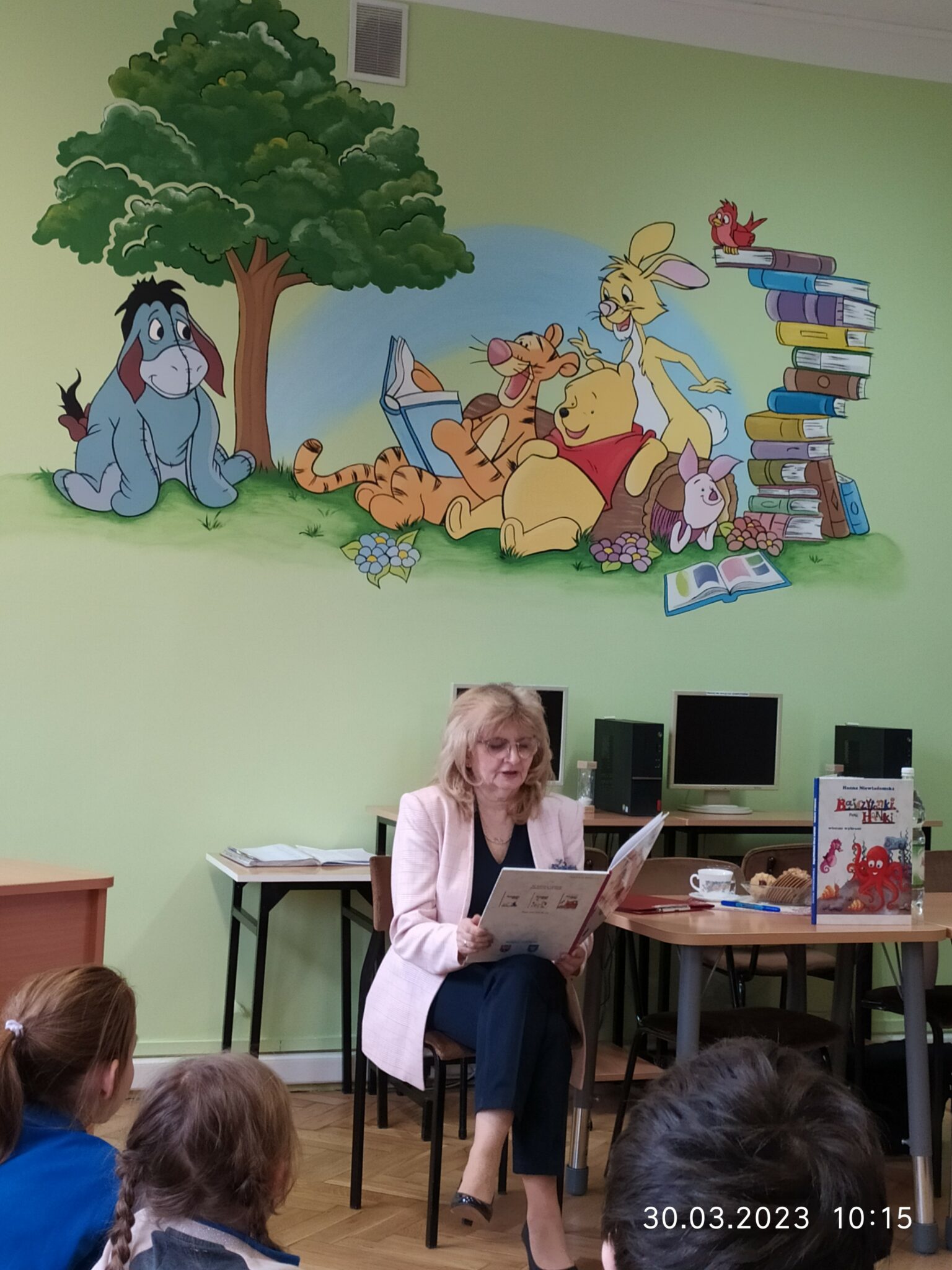 30 marca biblioteka szkolna zorganizowała dla uczniowie klas 1-3 spotkanie, którego gościem była Pani Hanna Niewiadomska, autorka zbioru wierszy dla dzieci „Bajczytanki Pani Hanki”. W czasie spotkania autorka stworzyła niezwykle serdeczną atmosferę. Zachęcała uczniów do czytania książek oraz uświadomiła dzieciom, że bycie „molem książkowym” niesie ze sobą wiele korzyści, rozwija wyobraźnię, poszerza wiedzę a przede wszystkim daje ogromną satysfakcję. Opowiadała jak powstaje wiersz, z czego się składa i skąd czerpie pomysły na swoje utwory. Sama jest autorką ponad dwustu wierszyków dla dzieci, które są zabawne i bardzo pouczające. Podczas spotkania wspólnie bawiliśmy się w dobieranie rymów i układanie wierszyków. Na koniec spotkania każdy uczeń otrzymał od pisarki pamiątkową zakładkę do książki oraz mógł zakupić książkę pisarki z autografem. Bardzo dziękujemy Pani Hannie za wesołe i twórcze zajęcia z poezją.
