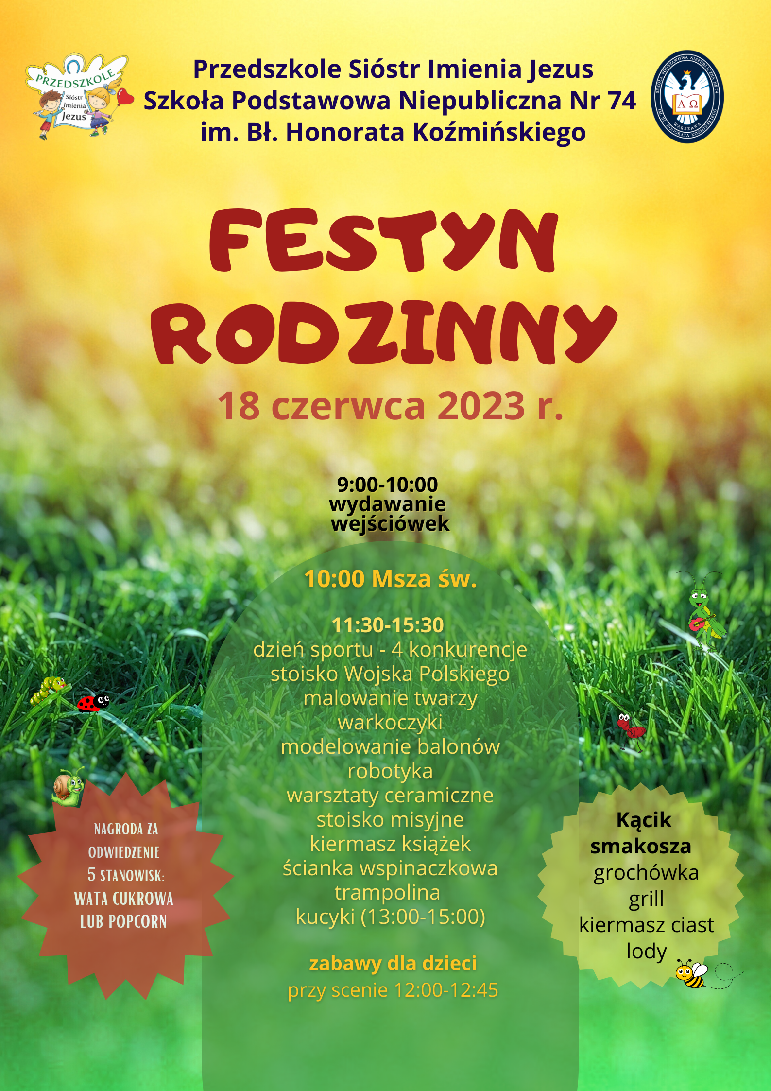 W niedzielę 18 czerwca 2023 r. odbył się Festyn Rodzinny. Wzięli w nim udział uczniowie, rodzice, zaproszeni goście oraz pracownicy przedszkola i szkoły prowadzonych przez Zgromadzenie Sióstr Imienia Jezus. Spotkanie rozpoczęło się Mszą świętą. Po wspólnej modlitwie na uczestników czekały liczne atrakcje: malowanie twarzy, warkoczyki, modelowanie balonów, warsztaty ceramiczne, stoisko Wojska Polskiego, stoisko misyjne, kiermasz książek. Organizatorzy zapewnili także smaczne przekąski: kiełbasę z grilla, grochówkę, watę cukrową, popcorn, lody. Przepyszne wypieki można było kupić podczas kiermaszu ciast. W doskonałej zabawie nikomu nie przeszkodził padający deszcz.