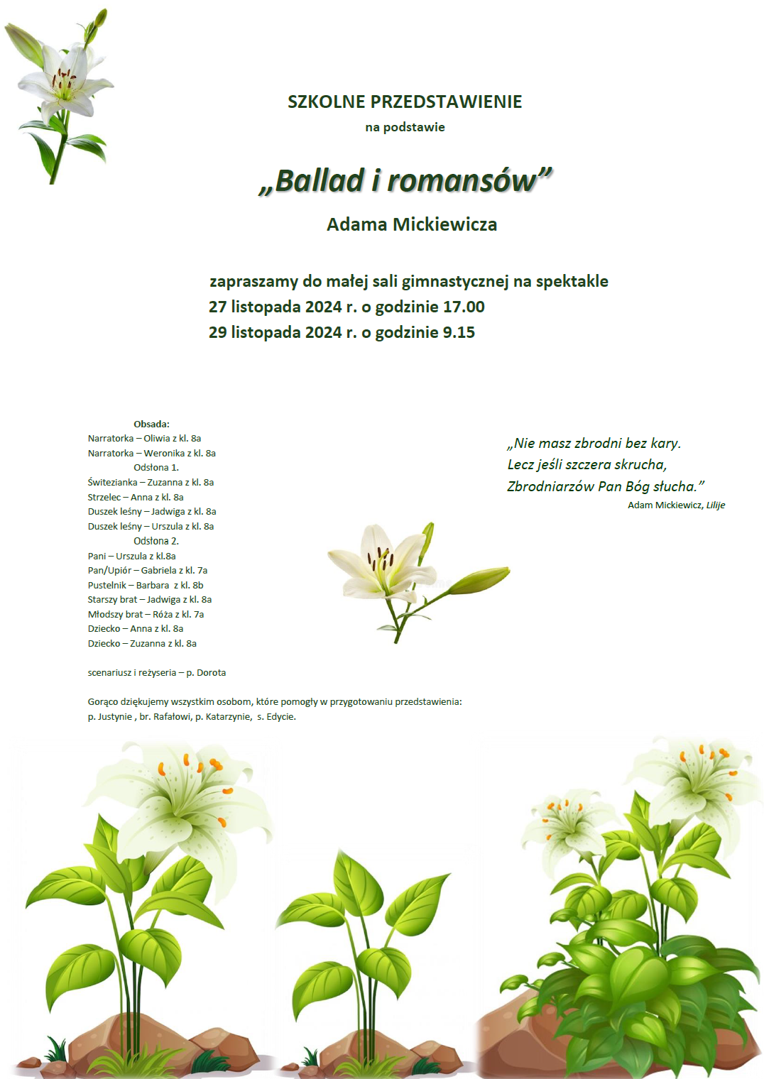 W przygotowaniu widowiska pomogli także inni nauczyciele: p. Justyna, br.Rafał, p. Kasia, s.Edyta.