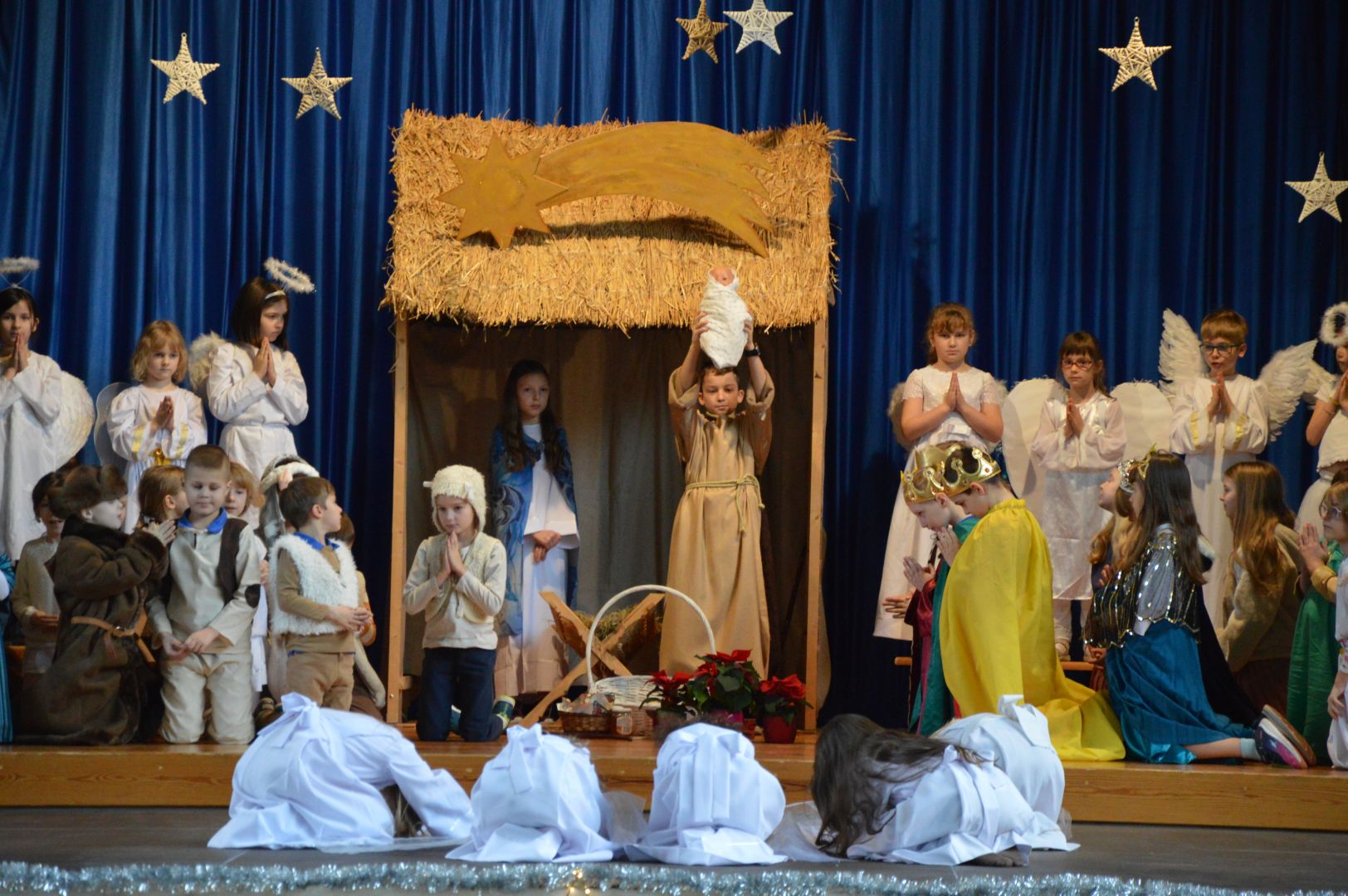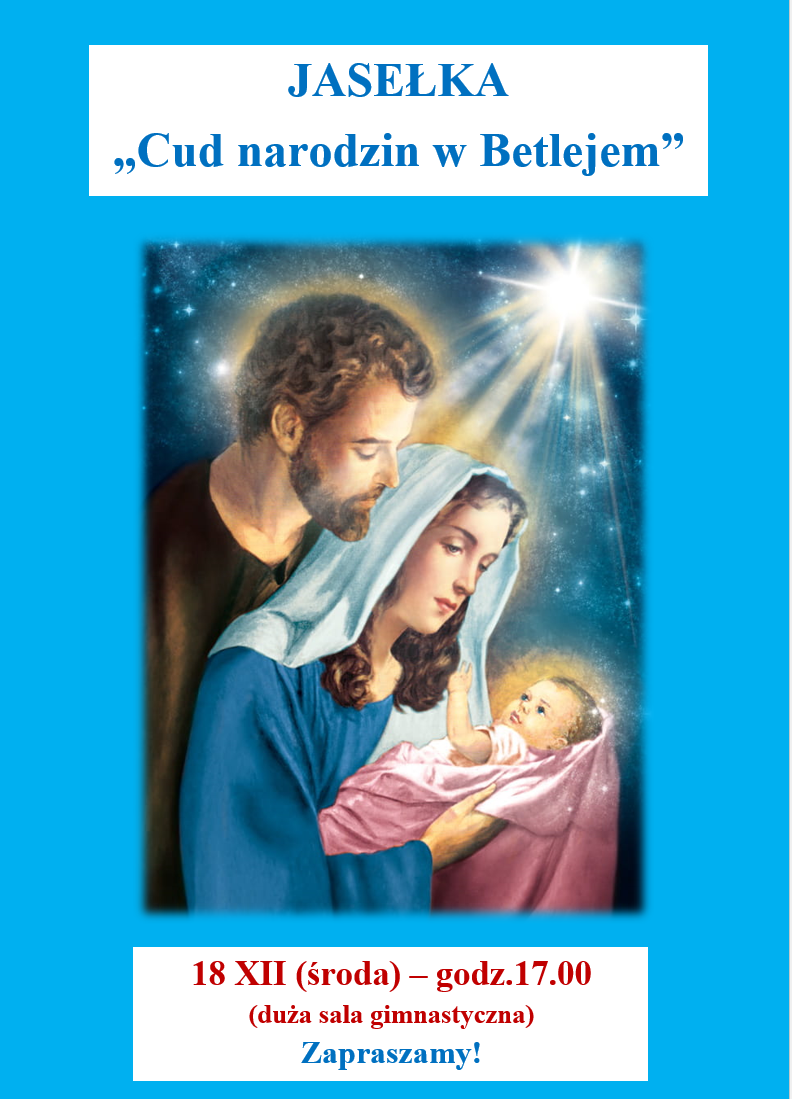 Tradycją naszej szkoły jest coroczne przedświąteczne przedstawienie. Nie inaczej było w tym roku- 18 grudnia w pięknie udekorowanej sali gimnastycznej zebraliśmy się wieczorową porą, aby obejrzeć Jasełka "Cud narodzin w Betlejem". Przedstawienie miało także swoją prapremierę w godzinach przedpołudniowych. Głównymi bohaterami byli młodzi aktorzy z klas 1-3 oraz Józef z kl.6, którzy pod opieką wychowawców oraz wspaniałej Reżyser- siostry Joanny, przygotowywali się dzielnie przed cały Adwent. O piękną oprawę sceniczną i muzyczną zadbali także zdolni wokaliści, instrumentaliści oraz tancerze z klas 4-7 pod przewodnictwem p.Leny. Przedstawienie pozwoliło na nowo przeżyć historię Świętej Rodziny i wprowadziło zgromadzoną publiczność w wyjątkowy świąteczny nastrój.