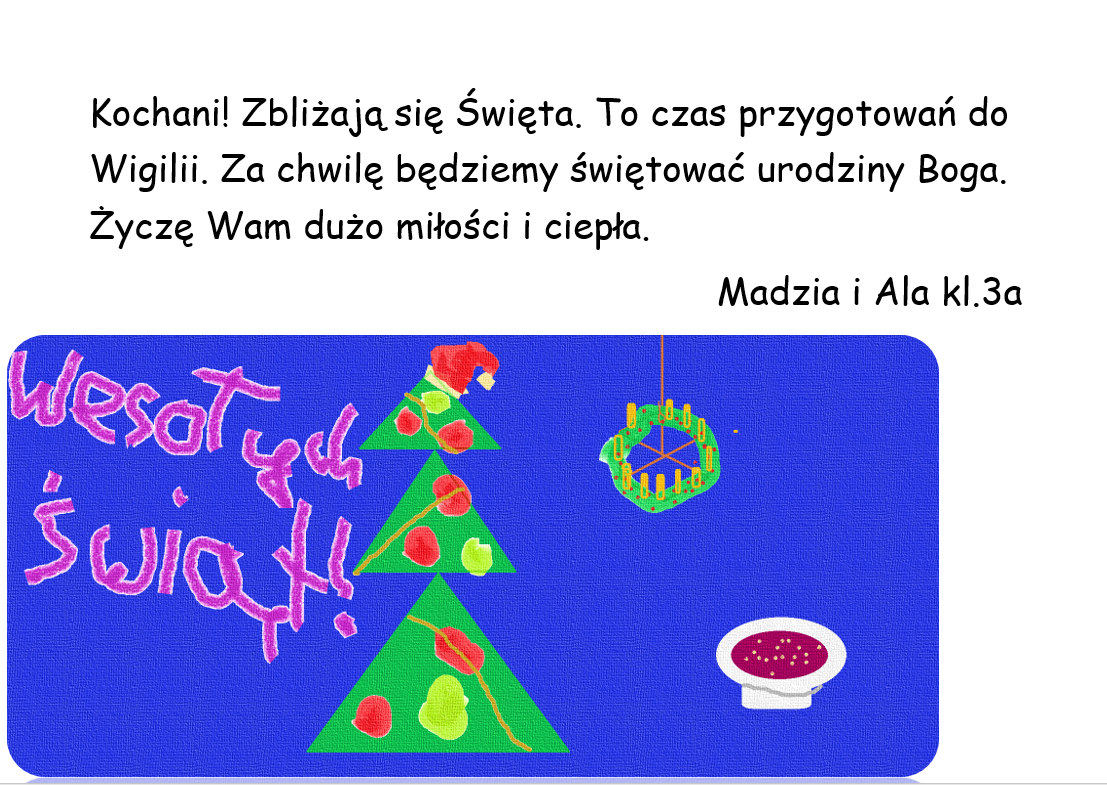 Zapraszamy do obejrzenia kartek świątecznych przygotowanych przez klasy 3 na zajęciach edukacji informatycznej.