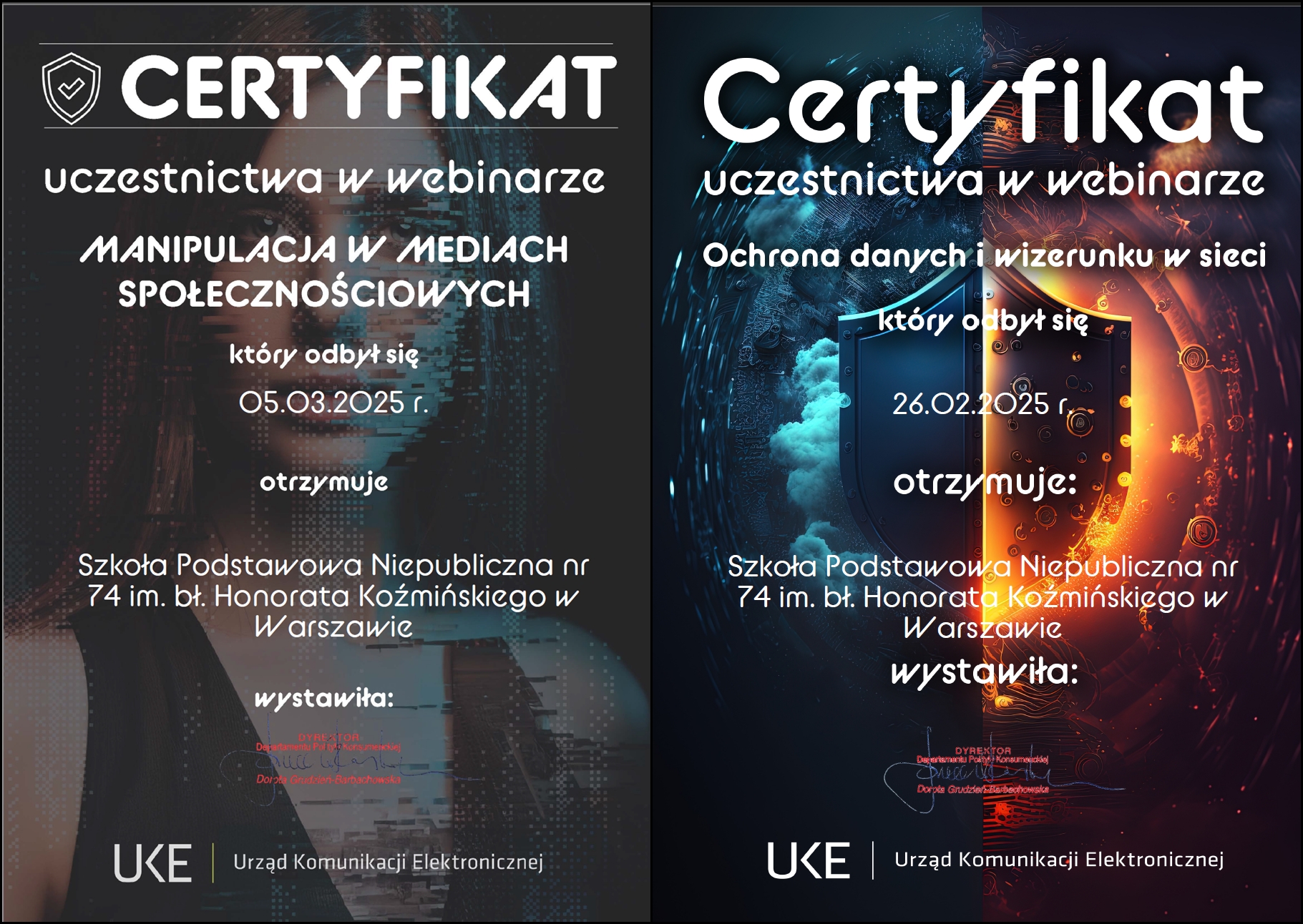 Uczniowie klas 4-8, wraz z blisko 20 tysiącami uczniów z całej Polski, w ostatnim czasie brali udział w webinarach organizowanych przez Urząd Komunikacji Elektronicznej. Uczniowie mieli okazję zgłębić jeden z najważniejszych tematów współczesnego Internetu – manipulację w mediach społecznościowych oraz dowiedzieli się jak chronić swoje dane i wizerunek w sieci. W dynamicznie zmieniającym się świecie cyfrowym niezwykle istotne jest, aby młodzi użytkownicy potrafili świadomie korzystać z treści dostępnych online, rozpoznawać zagrożenia i unikać pułapek manipulacji.