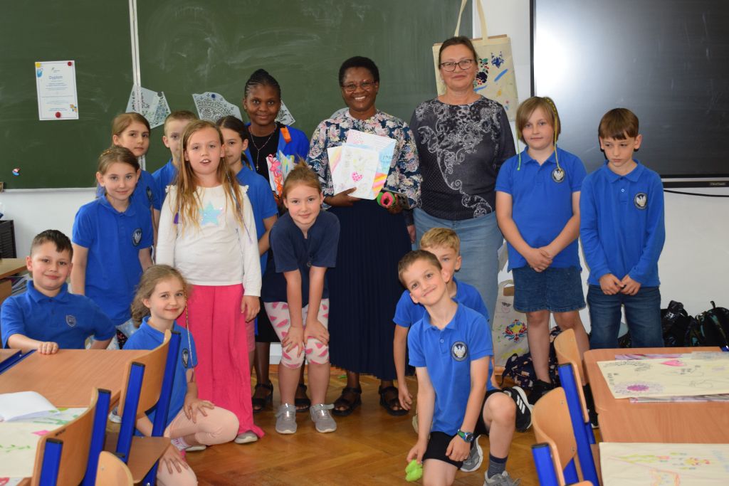 18 czerwca odwiedziły naszą szkołę Siostry Imienia Jezus posługujące w Namibii. Podczas spotkania z uczniami s. Bakhita opowiedziała o swoim kraju i zwyczajach ludności tubylczej. Uczniowie także mieli możliwość zatańczyć w rytmach afrykańskich, nosić na głowie podarunki i mieszać w afrykańskich miskach. Natomiast s. Faustina i s. Judyta przedstawiły działalność misyjną sióstr w Katima Mulilo. Po interesującej prezentacji nastąpiły podziękowania i wzajemne obdarowanie prezentami. Obecność sióstr misjonarek była miłym akcentem kończonym kolejny rok szkolny, w którym kontynuowana była pomoc najuboższym dzieciom w ramach akcji „Mój kolega z Afryki”.