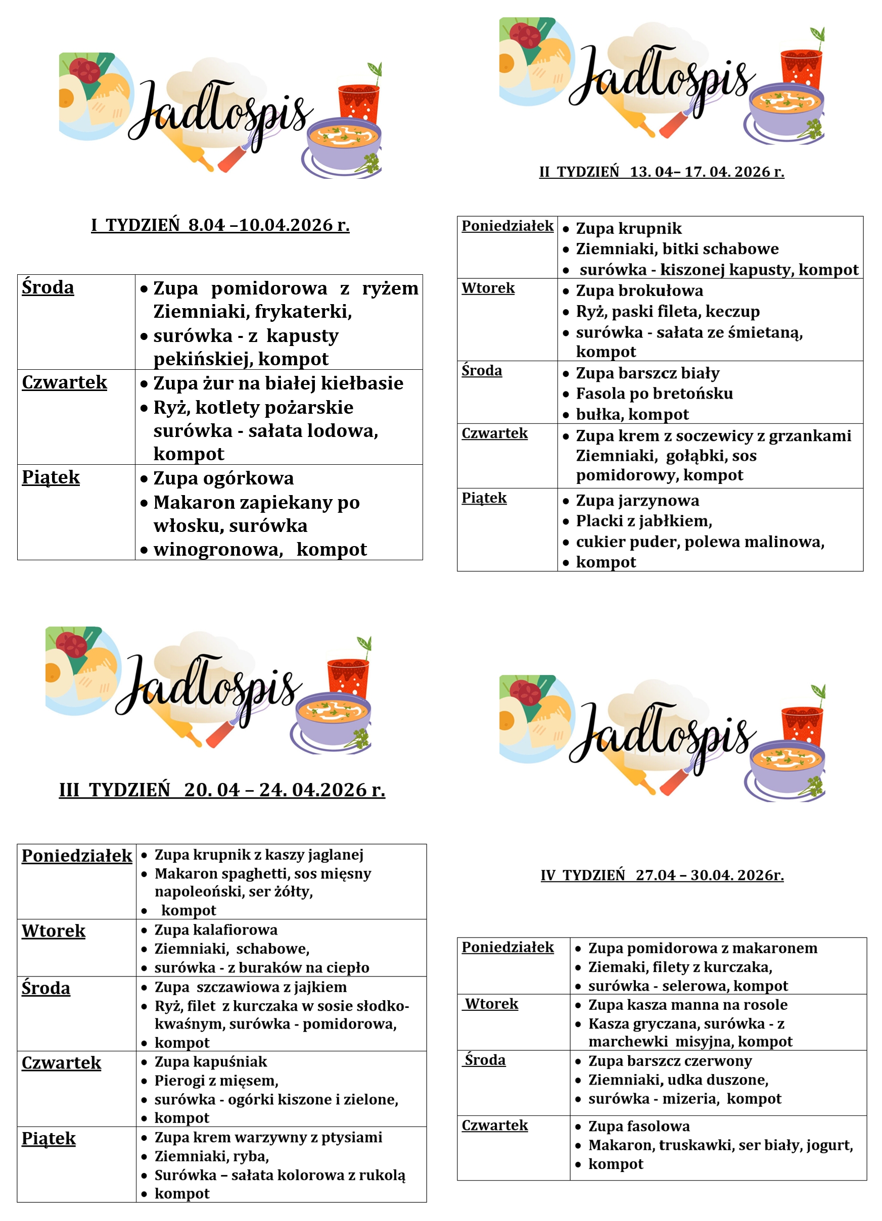 Jadłospis może ulec zmianie w wyjątkowych sytuacjach. Aktualności – na głównym holu.